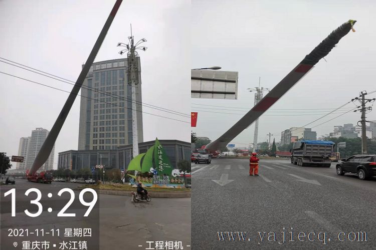 路过街道十字路口时,叶片车为避让来往穿梭车辆,特别是正在街道施工的大型工程车、和信号塔,将叶片举升30度,高耸的叶片居然俯视这栋楼宇,这就要求将左右前三个路口警戒起来,在完成举升后在将速度降至5公里/小时,平稳向右偏航,通过十字路口后将举升降至15度。
