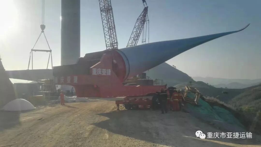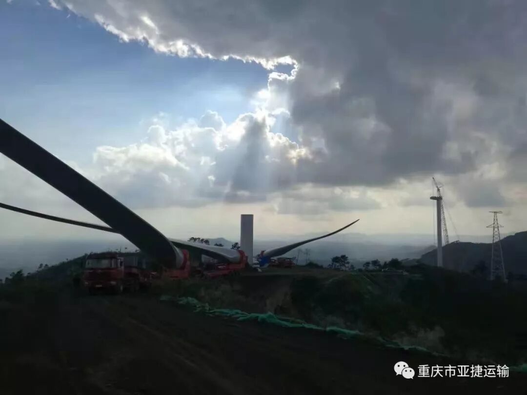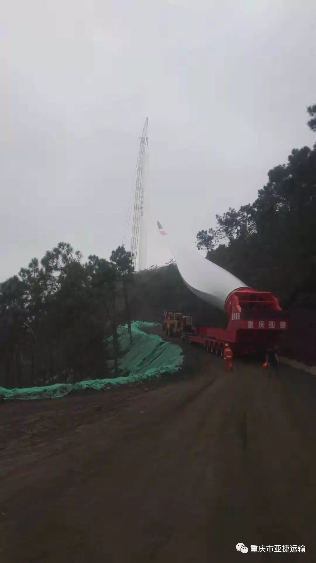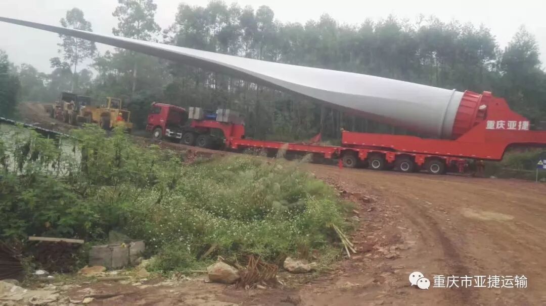 2018年我公司承运海装广西灵山八一茶厂项目 3MW风电设备,在该项目中,我公司负责叶片运输,其中叶片最长达到68.6米,是我公司第一次运输如此长的叶片,非常具有挑战力。