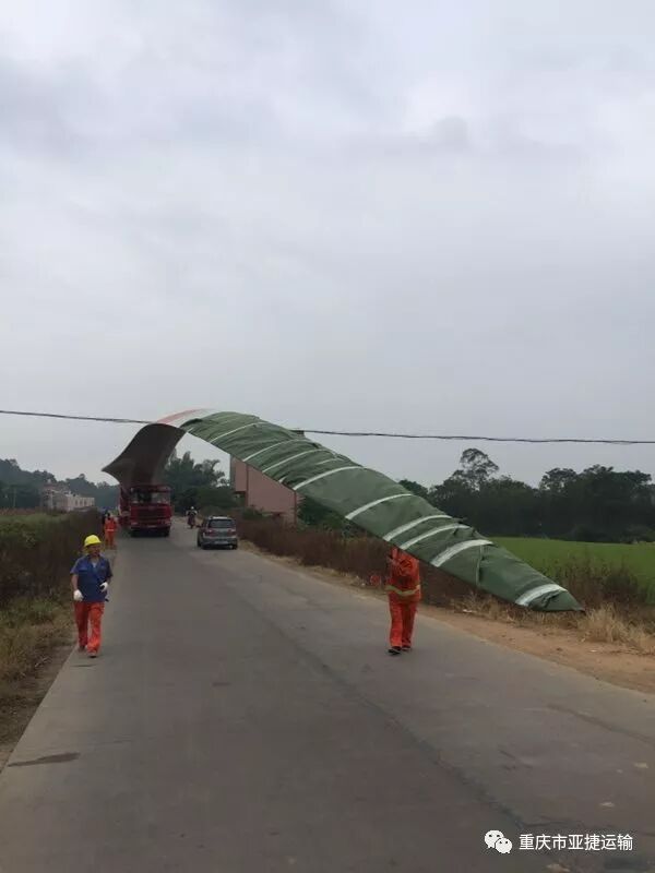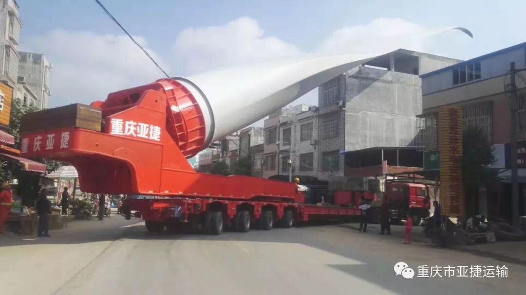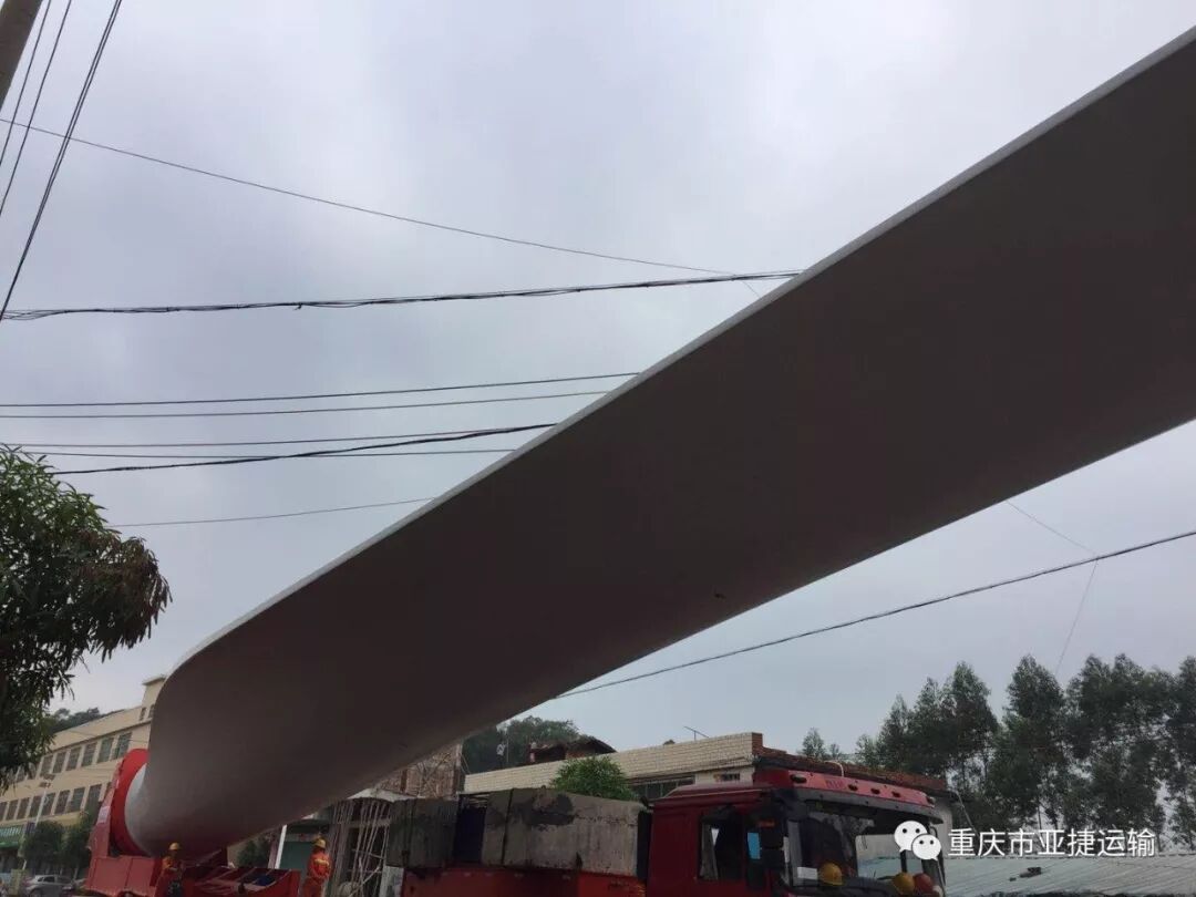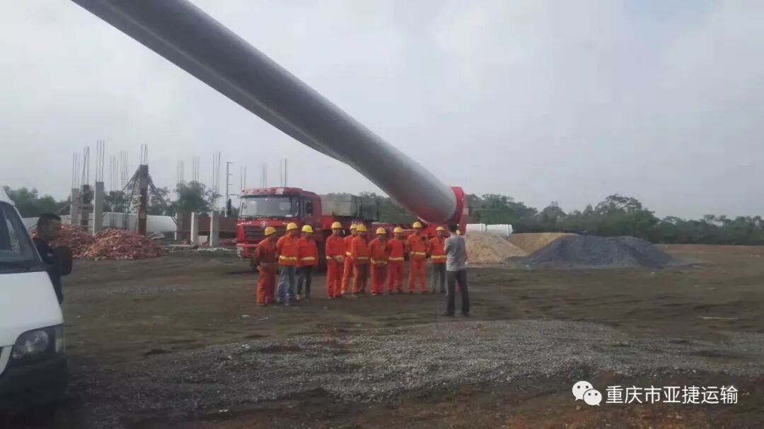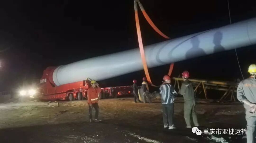 2018年我公司承运海装广西灵山八一茶厂项目 3MW风电设备,在该项目中,我公司负责叶片运输,其中叶片最长达到68.6米,是我公司第一次运输如此长的叶片,非常具有挑战力。